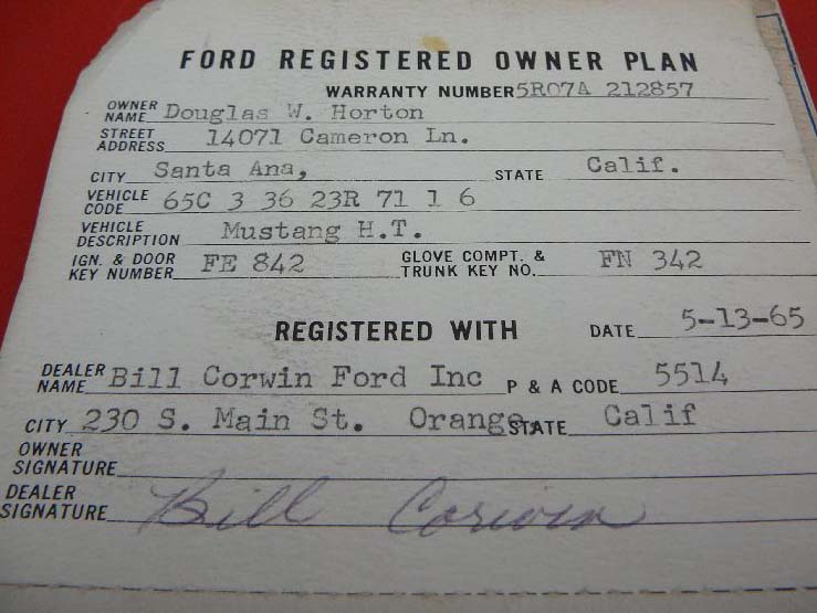 1965 Ford Mustang Coupe GT A code 289 V8 Auto VIN 5R07A212857 Original GT with original engine that is not running - will need rebuild Options include GT - driving lights, dual exhaust with trumpets, Kelsey Hayes disc brakes etc power steering factory air conditioning - missing pump and and bracket rare front bench seat GT has all new seat upholstery and foam kit fitted prior to shipping. Very solid rust free Californian black plate coupe with all original panels bar right hand quarter that was replaced years back. Original colour of GT is PoppyRed which is now faded. Top quality bodied GT, ideal for restoration due mid April SOLD Car ID#392 - Return to Index |