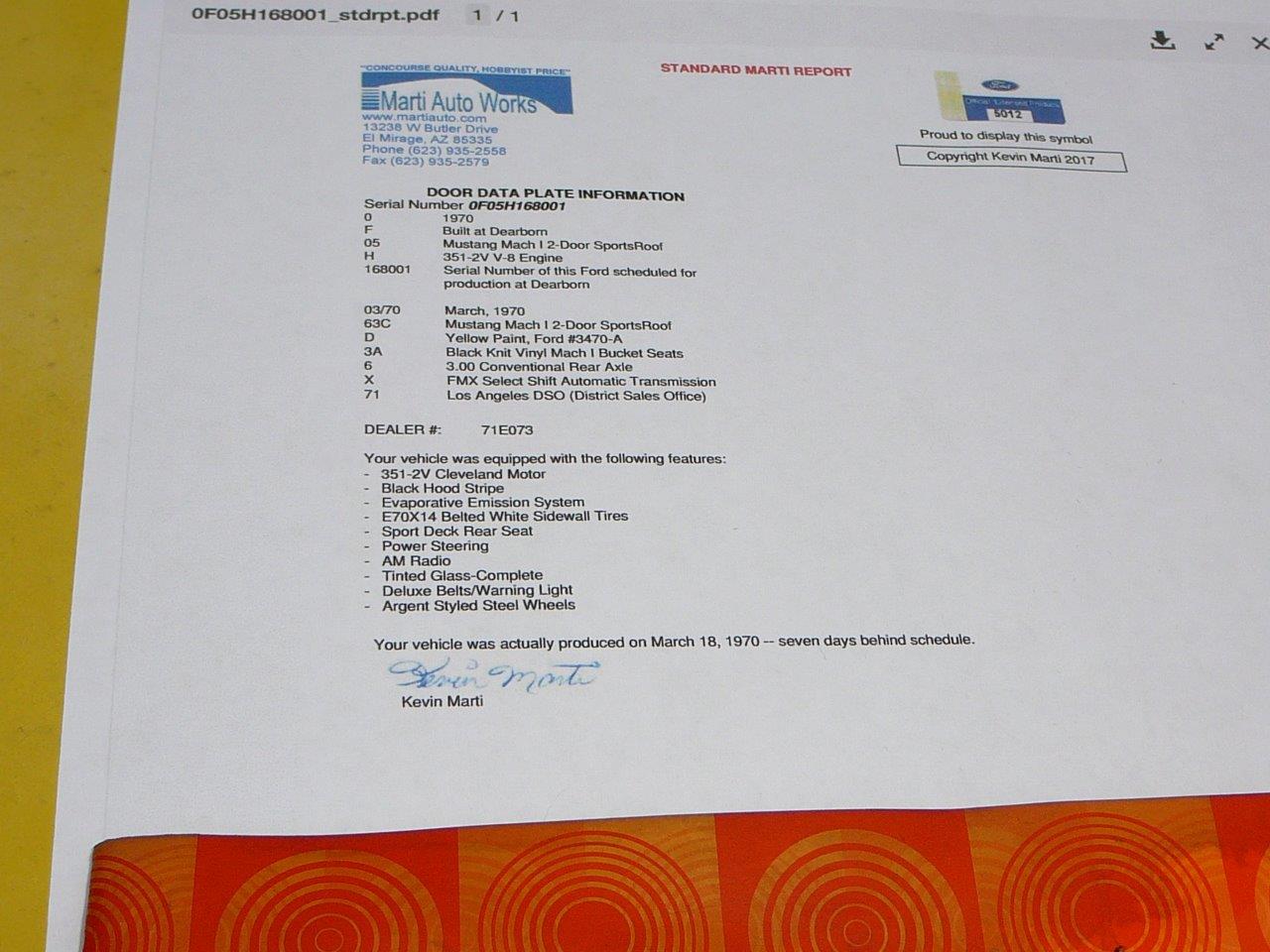 1970 Ford Mustang Fastback Mach 1 351 2V V8 Auto VIN OF05H168001 Options include in transit due end of March SOLD Car ID#516 - Return to Index |