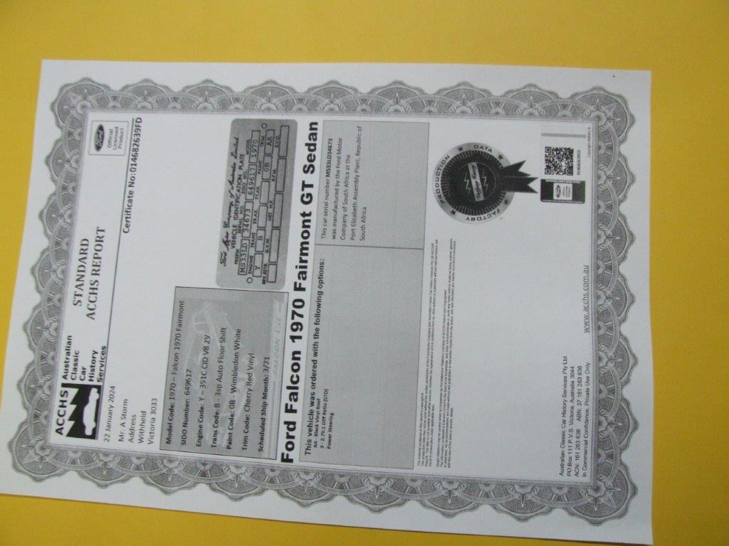 1970 Ford Falcon Fairmont GT sedan 351 C CID V8 2 V auto VIN MS33LD34673 Serial number of ford MS33LD34673 was manufactured by the Ford Motor Company of South Africa Engine is a 351 C CID V8 2 V Trans auto Note this is not a replica GT - it is an original Fairmont GT at an attractive price - check out photos for quality SOLD Car ID#640 - Return to Index |